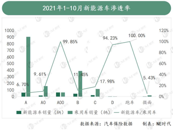 據(jù)汽車保險(xiǎn)數(shù)據(jù)顯示,目前整個(gè)乘用車市場(chǎng)以A、B、A0、C、A00級(jí)車為主。 以今年前十個(gè)月的銷量來看,這些主流級(jí)別車型中,新能源車滲透率最高的還是A00級(jí)車型,其他級(jí)別車型的電動(dòng)化替代空間基本都在90%以上。A級(jí)車作為乘用車市場(chǎng)體量最大的一部分,也是目前電動(dòng)化轉(zhuǎn)型壓力最大的一個(gè)市場(chǎng)。