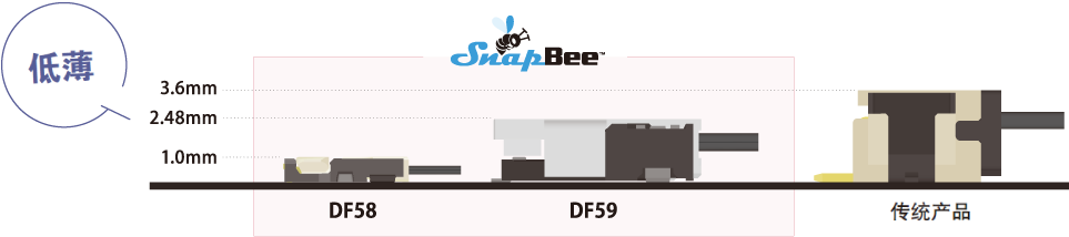 支持28 AWG,高度1.0mm,是業內最低薄級別的小型連接器。DF58系列是SnapBee中在低薄構造和窄間距方面最具優勢的產品,有助于實現機器設備的小型化。較大的有效嵌合長度可以實現穩定的連接。