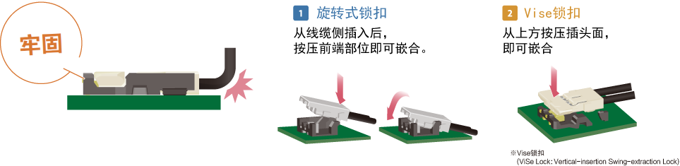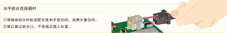 垂直嵌合不影響其他元器件,有效節省空間,提高基板設計自由度。采用從上向下的嵌合方式,易于確認嵌合口,從而更好地確定插